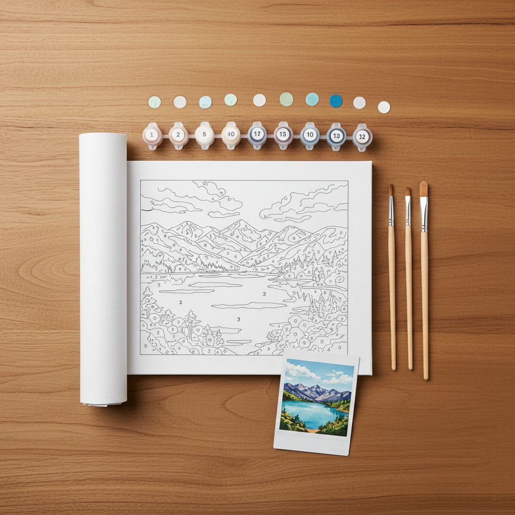 - You receive your kit with paints, brushes, and numbered canvas